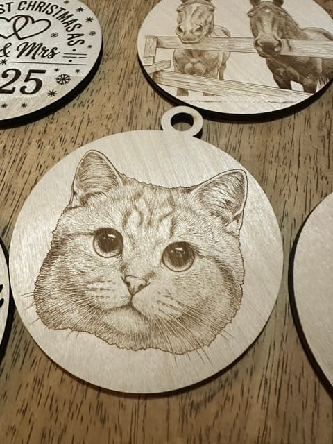 Honor the memory of your beloved feline companion with this personalized cat memorial ornament, beautifully crafted to keep their spirit close to your heart. This custom wooden keepsake features a highly detailed engraved portrait of your cat, making it a timeless tribute you can cherish forever.
